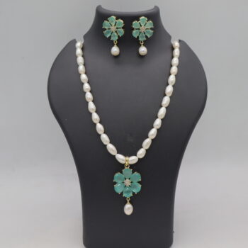 • Goldent Base Light Green Stone Pendent Pearl Neckalce.